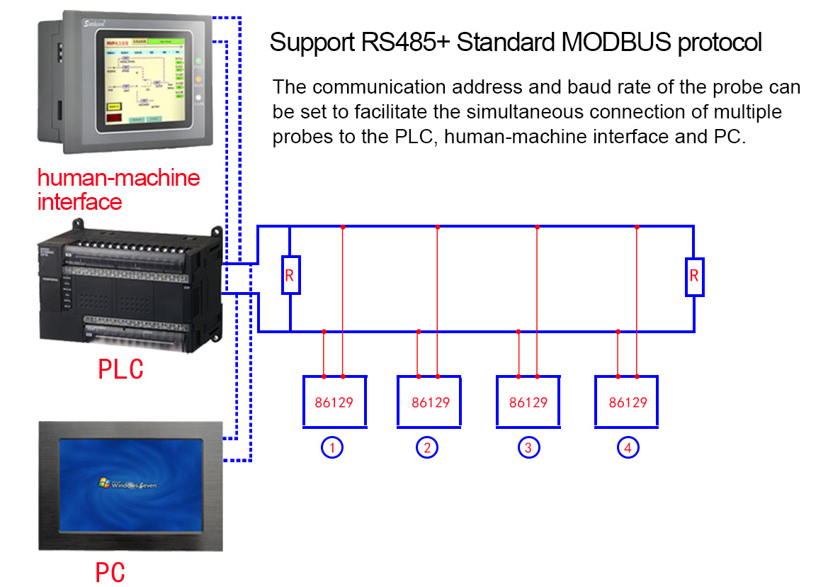 Supports the standard MODBUS protocol. Measurement data can be read and communication parameters (address and baud rate) can be set via the protocol. For detailed commands, refer to the "Digital Probe Communication Protocol".