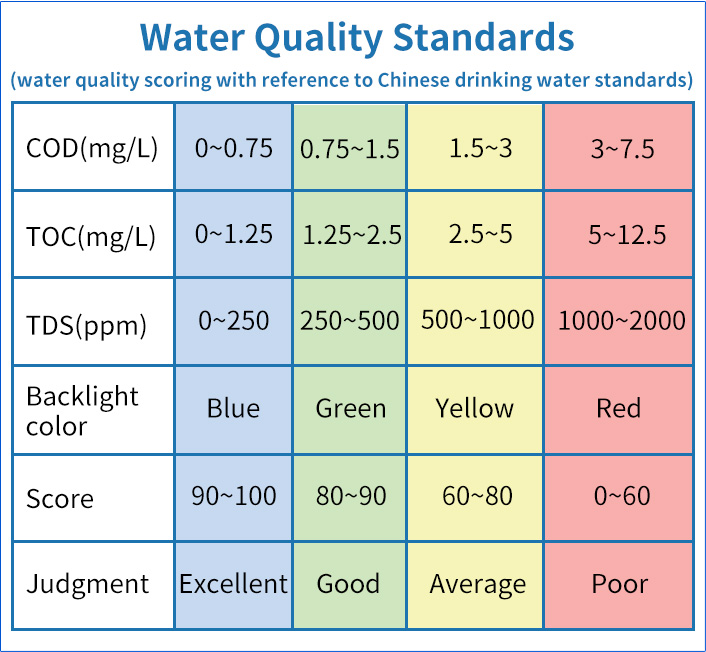 The display automatically changes its backlight color according to the water-quality rating: Excellent, Good, Average, or Poor. The interface is intuitive and easy to understand.