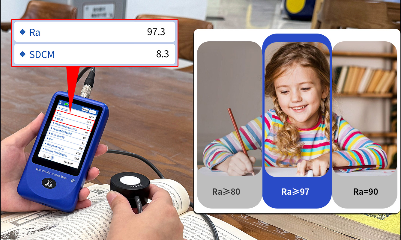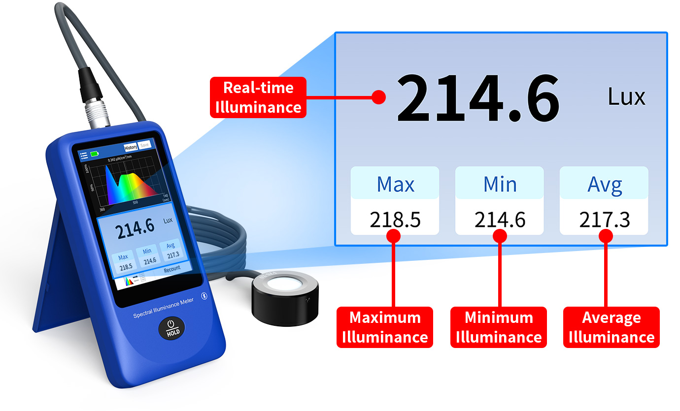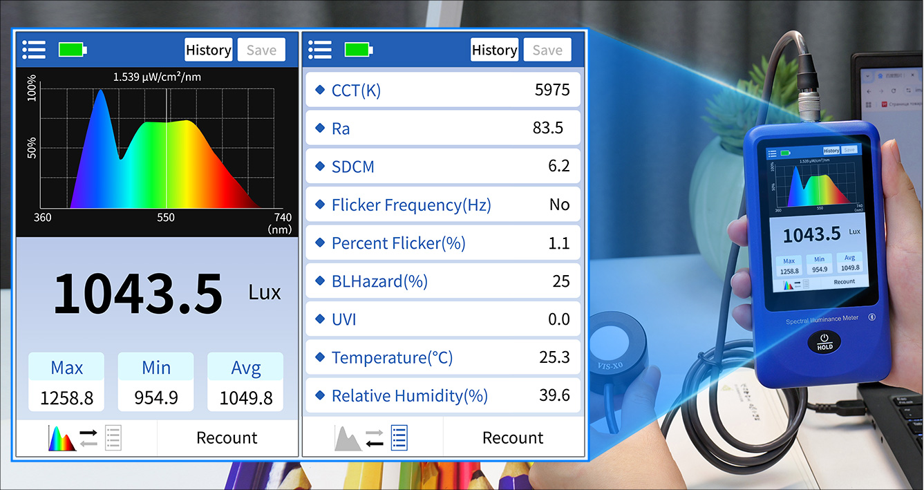Measure Lux, spectrum, CCT, CRI, SDCM, flicker, blue light hazard, UV index, temperature, and humidity—offering a full assessment of light sources for diverse applications.