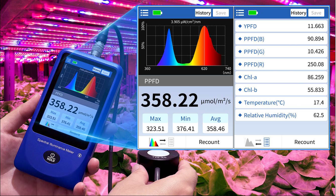 It also features a Plant Lighting Mode for accurate measurement of PPFD, blue/green/red PPFD, YPFD, chlorophyll A/B, temperature, and humidity—offering reliable support for home gardening, greenhouses, plant factories, and agricultural research. It can help users achieve efficient, intelligent light management and improve both the growth rate and quality of plants.