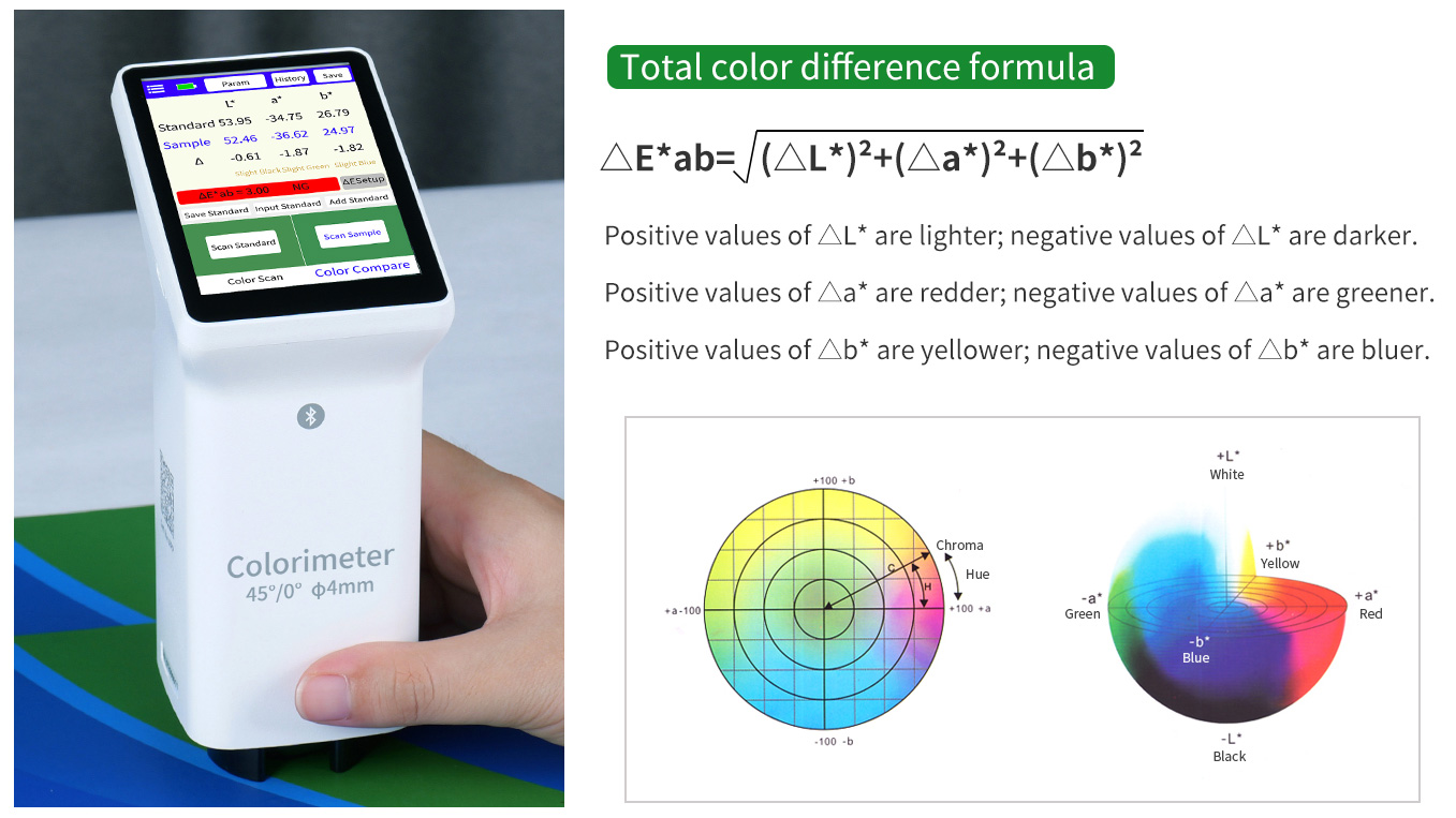| Color difference formula | ΔE*ab, ΔE*uv, ΔE*94, ΔE*cmc(2:1),ΔE*cmc(1:1), ΔE*00, ΔE*cmc(1.4:1) |