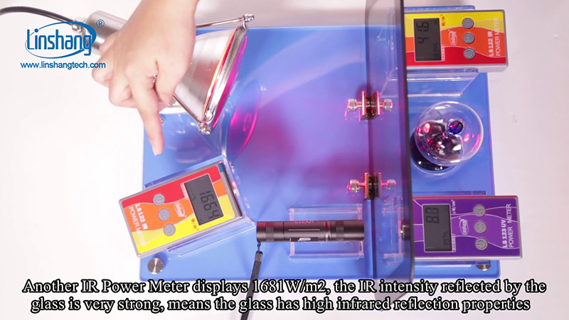 Linshang FS2150 sales kit, also known as insulated glass reflection power demonstration kit, it can simulate infrared and ultraviolet rays in sunlight through infrared lamps and ultraviolet flashlights. The instrument can demonstrate the UV and IR rejection performance and IR reflection performance of measured materials. This demonstration instrument is equipped with a special aluminum case and exhibition stand, which is convenient for carrying out and quick installation. It is suitable for demonstration of heat insulation and UV rejection performance of various materials such as solar film, heat insulation glass and energy-saving glass.